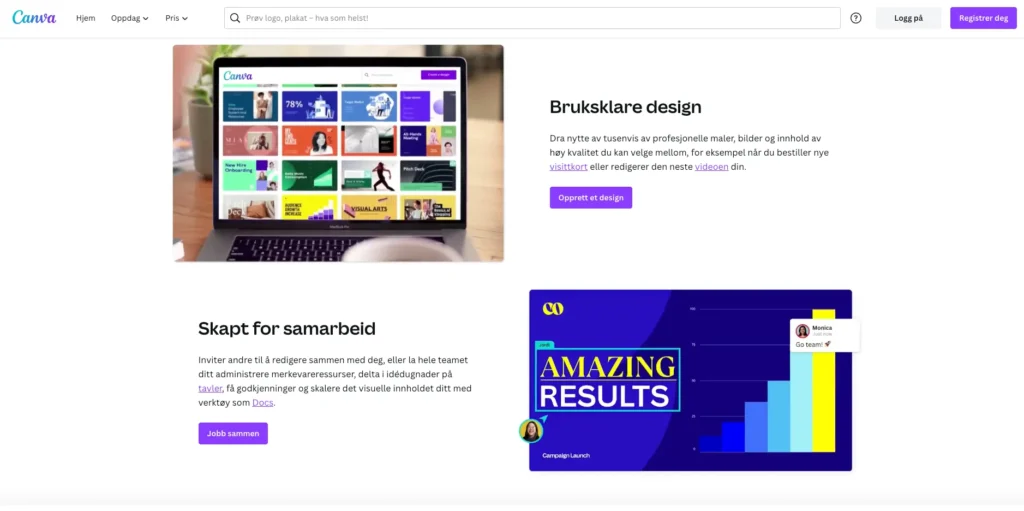 Dette er en designplattform der du kan lage profesjonelle grafiske design. Du trenger ikke å ha designferdigheter for å bruke Canva. Plattformen har et intuitivt drag-and-drop-grensesnitt som gjør det enkelt å tilpasse bilder og tekst slik du vil ha det.